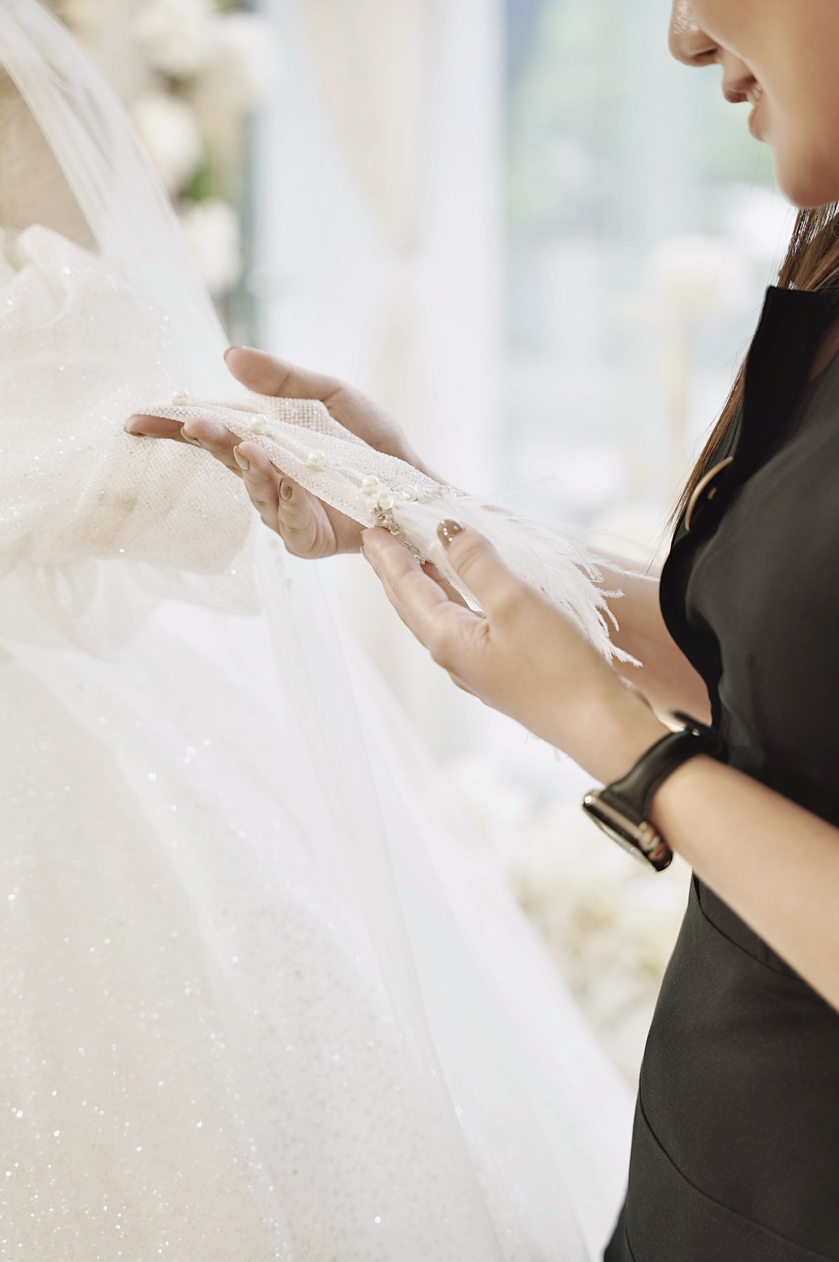 Phía dưới lớp vải ôm lấy cánh tay nàng và được đính kết chi tiết lông vũ.